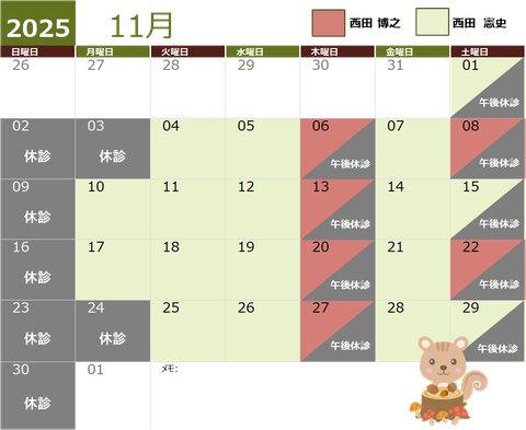 10月・11月は以下の予定で診療いたします。休診日、外来担当医の確認はこちらをご覧ください。