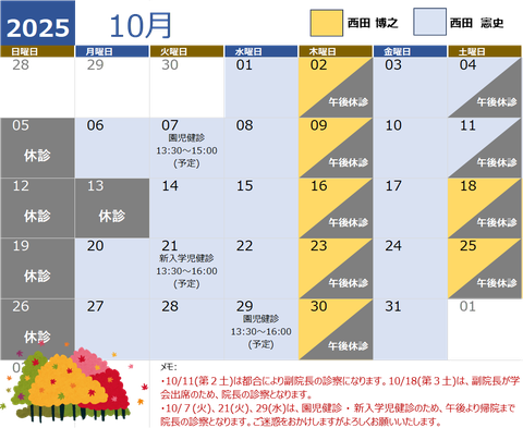 10/7(火)、21(火)、29(水)は、園児健診・新入学児健診の為、午後より帰院までの間院長の診察となります。